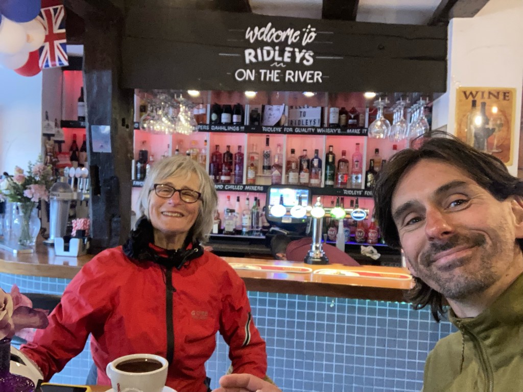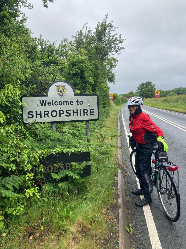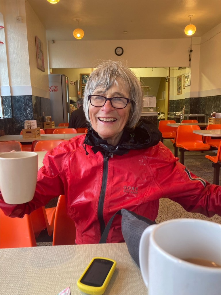 The rain is already pelting down, but off we go. The A449 was chosen to cut mileage but the road surface is rough and potholed, a nightmare to ride on, and so it’s a relief to get to Kidderminster where we head to a friendly café (which has the heating on). Oh the joy of hot coffee.