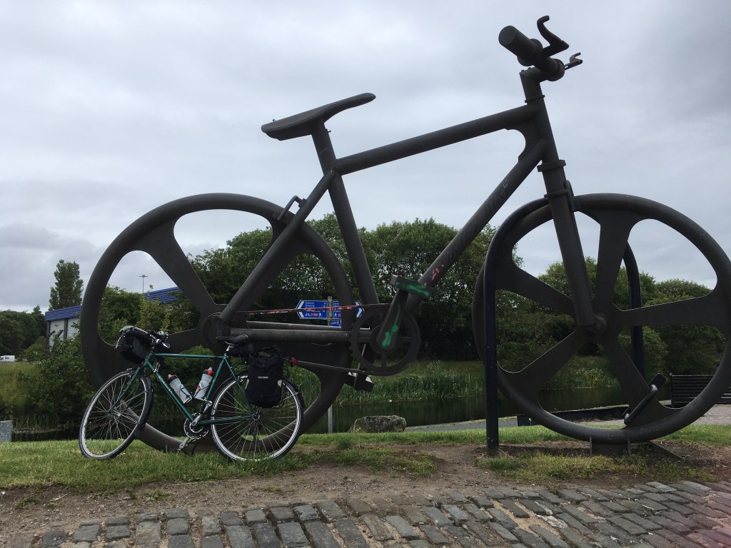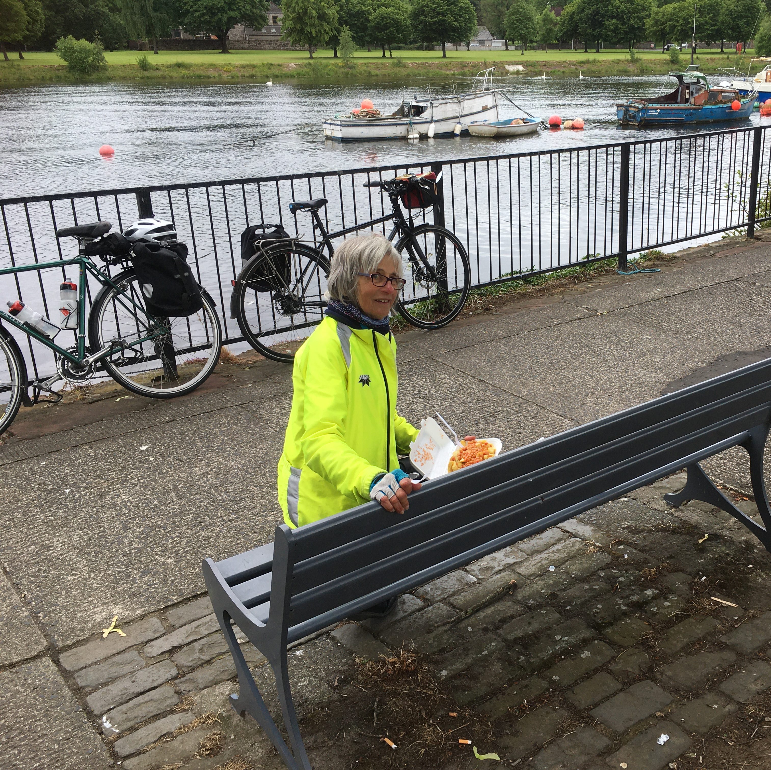 The weather was lovely all day, and the cycle path was easy and pretty all the way to the B&B (well, once I found it that is!), not far from which I met up with Paul again. I had an ideal lunch stop by the river Leven – chips and beans from a chip shop.